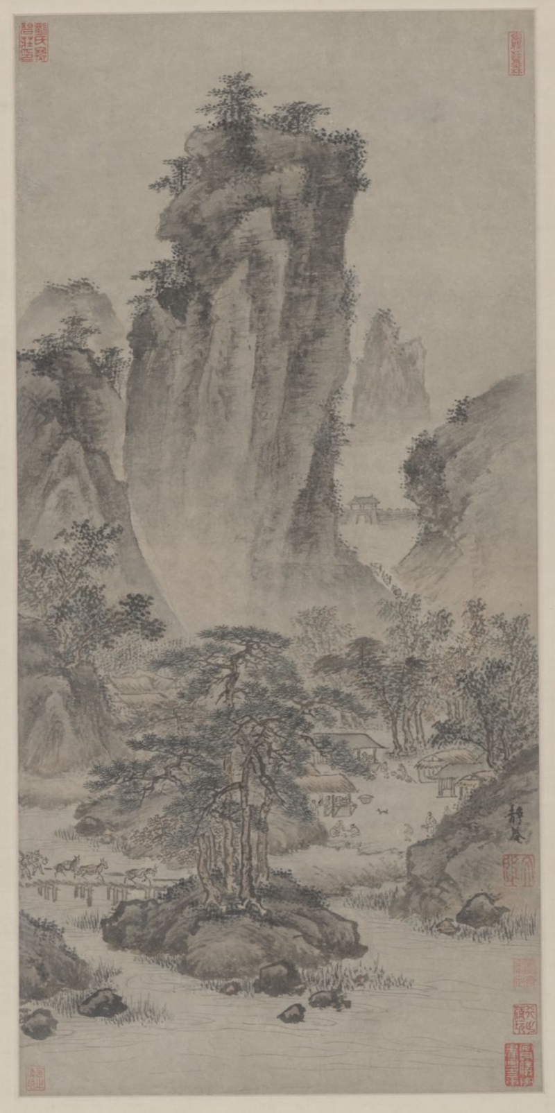 戴进的诸多作品皆可看出诸家的遗凮。《雪山行旅图》兼有李成、郭熙、范宽笔意;《听雨图》与盛懋的《隔山河色》造境相似;《长松五鹿》有米芾、高克恭之笔意;《仿燕文贵山水》尽显“米家山水”之境界。