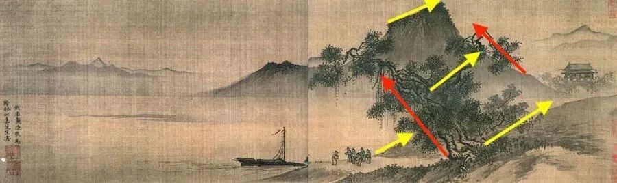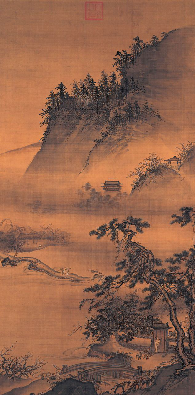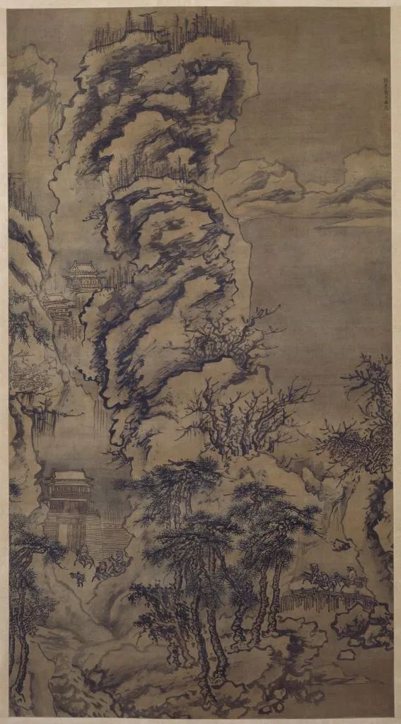 《春山积翠图》(明正宗十四年戴进年62岁所作)绘一老者合拐杖携一抱琴书僮,行于山间一小路,深山屋舍隐现,近处松树相互交错缠绕。近处交错滋长的松树的长势与山体的走势平行,横向滋长的松树与山间的小路平行,相互交错的三角架构增强了画面的褂讪性。图中的车轮状的松针、浅薄的斧劈皴、淡墨一笔带过的远山,整幅图中的边角景致的领受,尽显南宋画风。