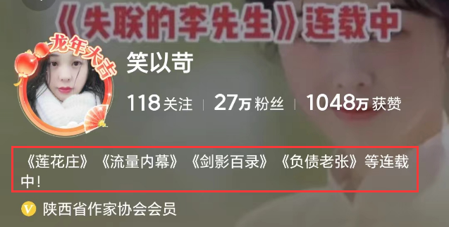 笃信瓜友齐猜到了,这个老敌手便是“笑以苛”,天然个东谈主支吾简介是作者,但是不雅众对她的作品并不老练,她的确成名于网络,与张兰息息相关。